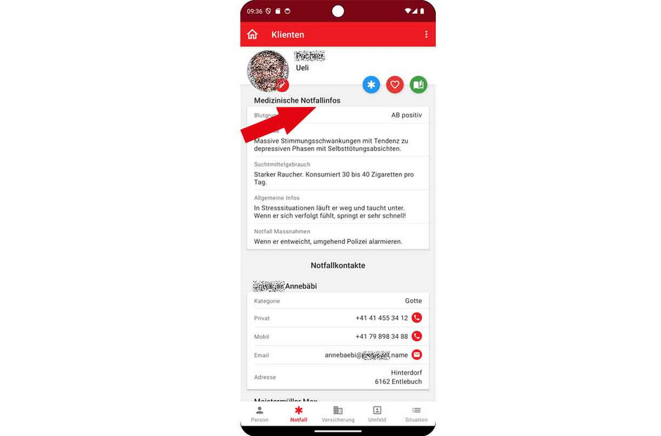 Für Notfälle sind alle wichtigen Notfallinfos sowie alle Notfallkontakte einer Klientin oder eines Klienten jederzeit verfügbar.