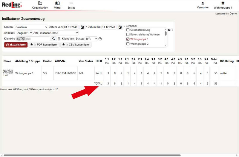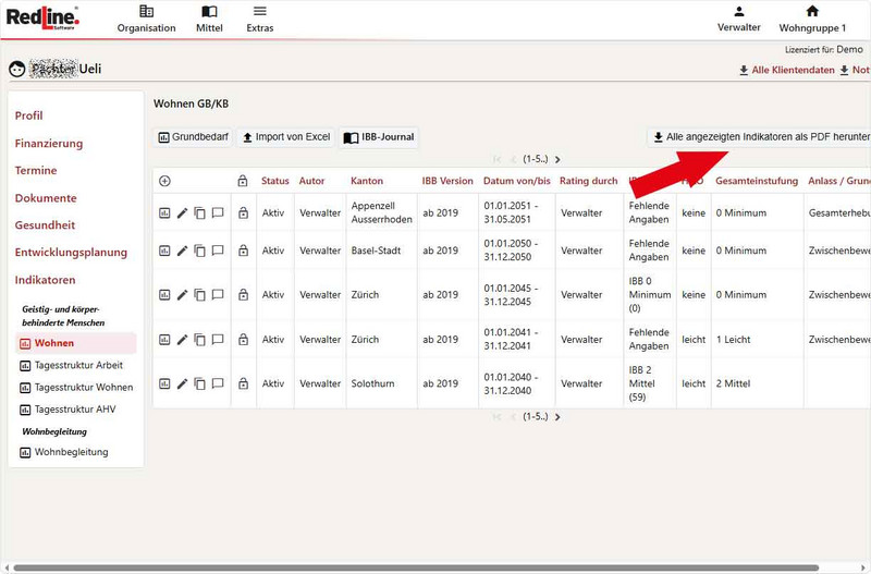 Über den Indikatoren Zusammenzug können die IBB-Bewertungen von verschiedenen Klienten über mehrere Bereiche aufgelistet werden.