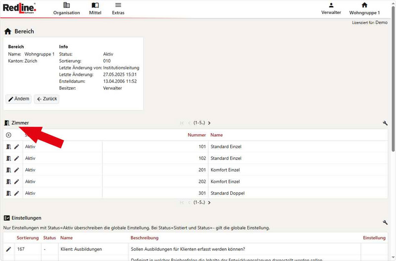 Für jeden Bereich können die einzelnen Zimmer erfasst werden.