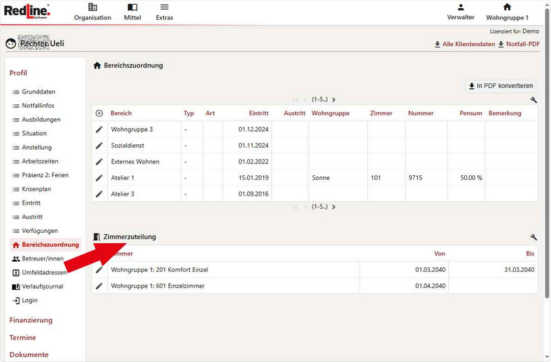 Über die Bereichszuordnung können die Zimmer einer Klientin oder einem Klienten zugeordnet werden.