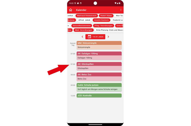 Alle Termine einer Klientin oder eines Klienten werden tagesaktuell aufgelistet und sind entsprechend ihrer Kategorie farblich gekennzeichnet.