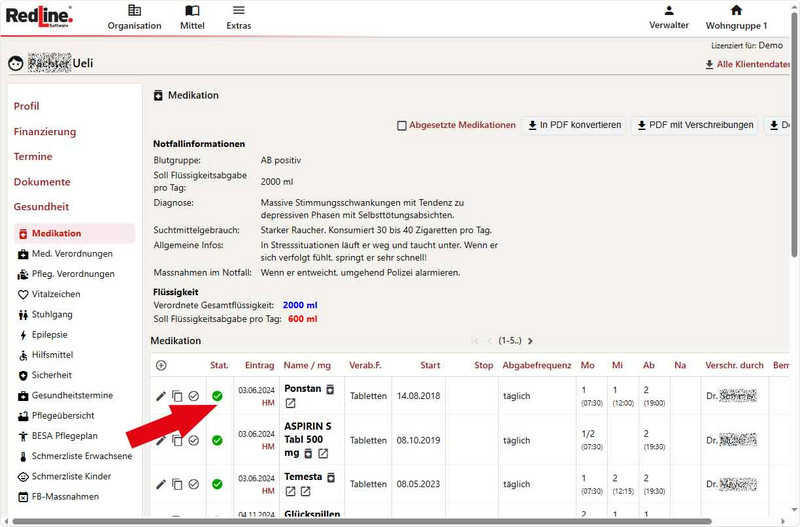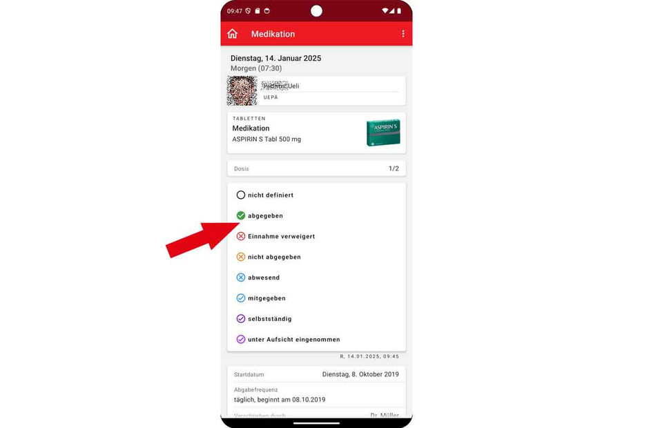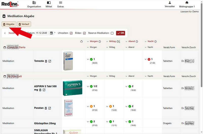Die Abgabe eines Medikaments kann differenziert dokumentiert werden. grün = abgegeben, rot = verweigert.