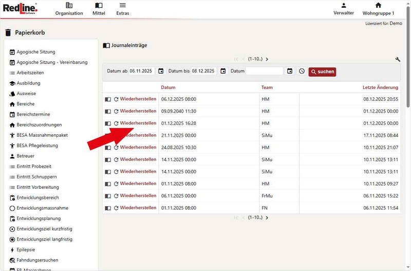 Gelöschte Elemente werden dauerhaft im Papierkorb gespeichert und können nötigenfalls wiederhergestellt werden.