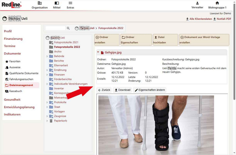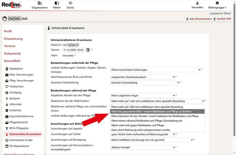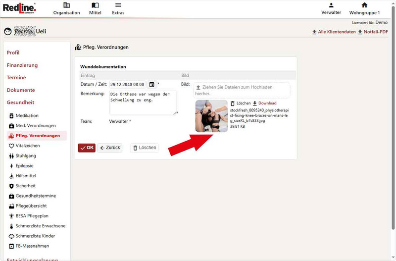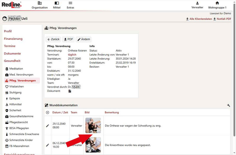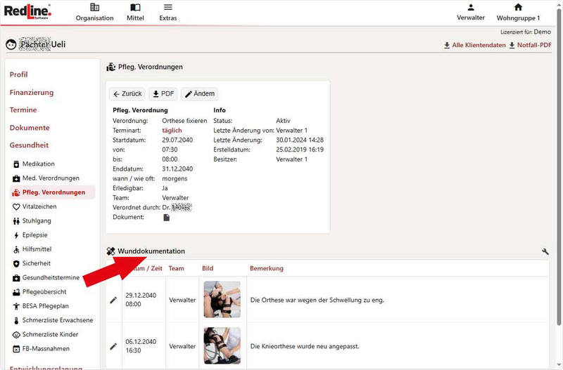 Pflegerische Massnahmen lassen sich mit RedLine übersichtlich erfassen und verwalten. Über die Wunddokumentation kann der Heilungsverlauf aufgezeichnet werden.