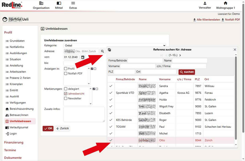 Alle wichtigen Adressen eines Klienten sind mit dem Klienten Dossier verknüpft und auf einen Blick vorhanden.