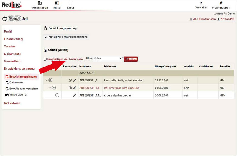 Für jeden Klienten lassen sich Ziele und Massnahmen definieren.