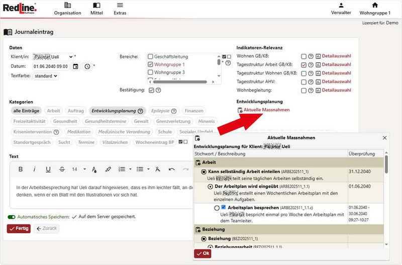 Journaleinträge können mit der Entwicklungsplanung verknüpft werden. Termine können bearbeitet werden.