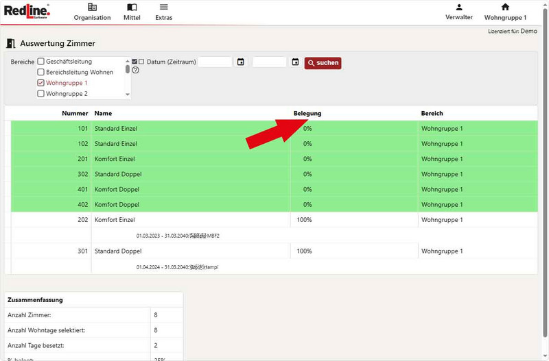 Über die Auswertung wird die Zimmerbelegung sowie die prozentuale Auslasung angezeigt.