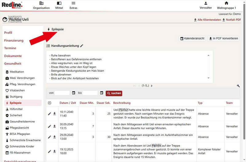 Epileptische Ereignisse können dokumentiert werden. Anleitungen geben jedem Betreuer genaue Anweisungen.