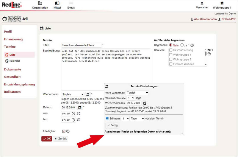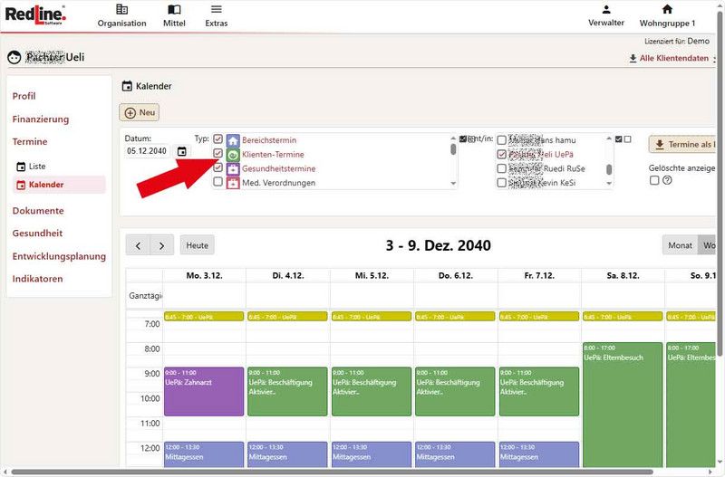 Alle Termine des Klienten, des Bereichs sowie die Gesundheitstermine werden übersichtlich angezeigt.