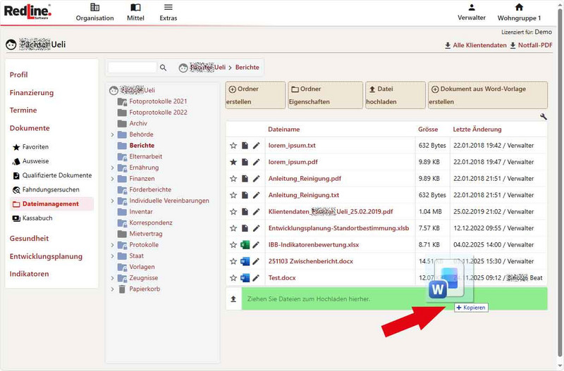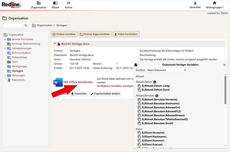 Dokumente im Format Word, Excel und PowerPoint können in RedLine gespeichert werden. Die Inhalte der Dokumente können direkt in RedLine bearbeitet werden. Vorlagen übernehmen die definierten Daten, die in RedLine gespeichert sind.