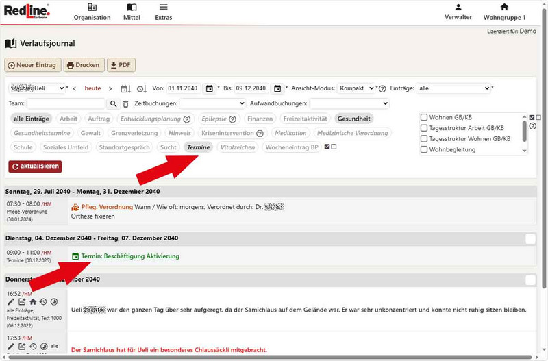 Termine können im Tagesjournal sowie im Verlaufsjournal angezeigt werden.