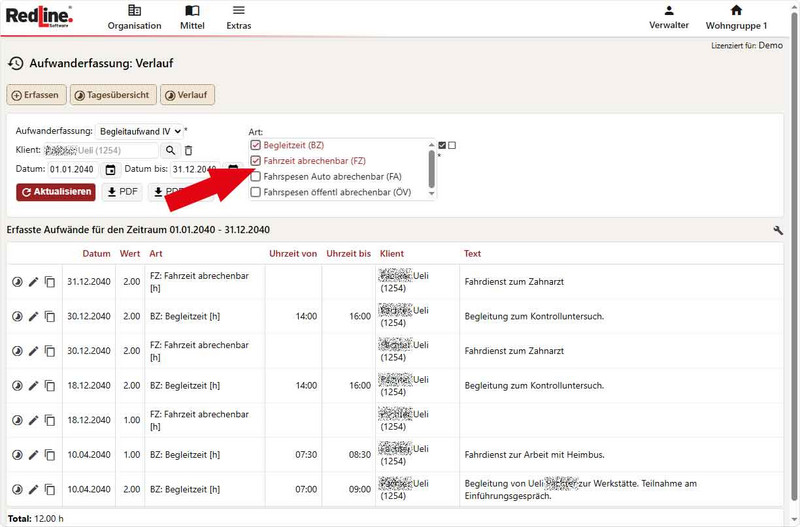 Die Aufwände können nach bestimmten Kriterien gefiltert werden.