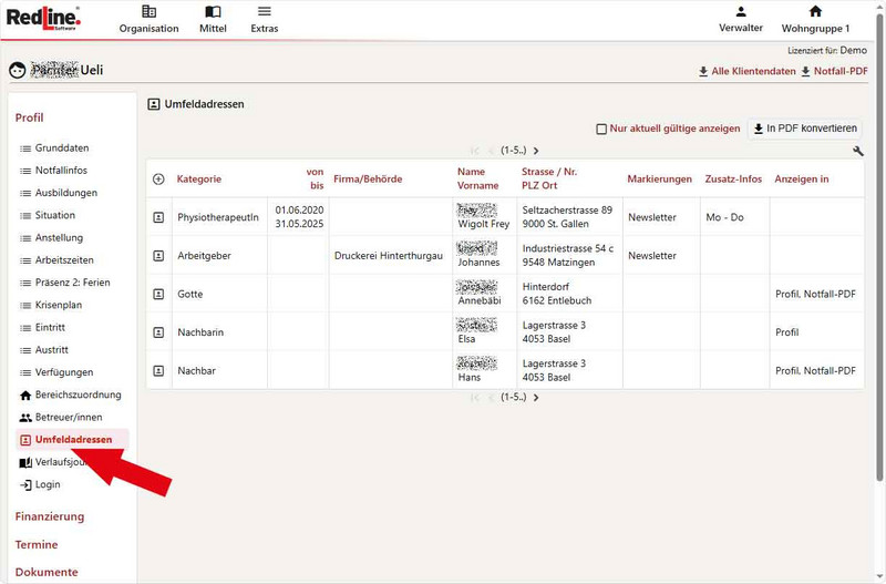 Alle Adressen, die einem Klienten Dossier zugeordnet sind, können als PDF-Dokument ausgedruckt werden.