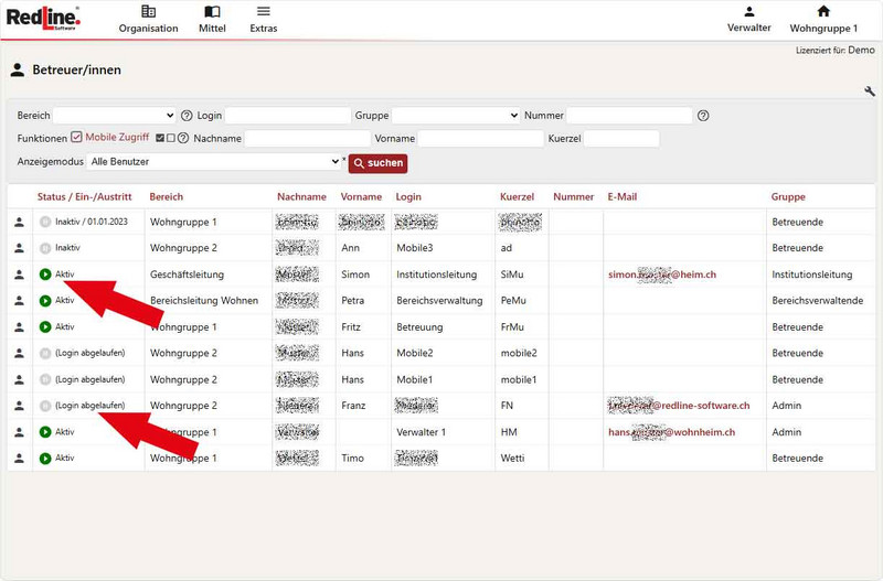 Alle Betreuungspersonen sind in einer Tabelle aufgelistet. Inaktive Logins werden automatisch deaktiviert.